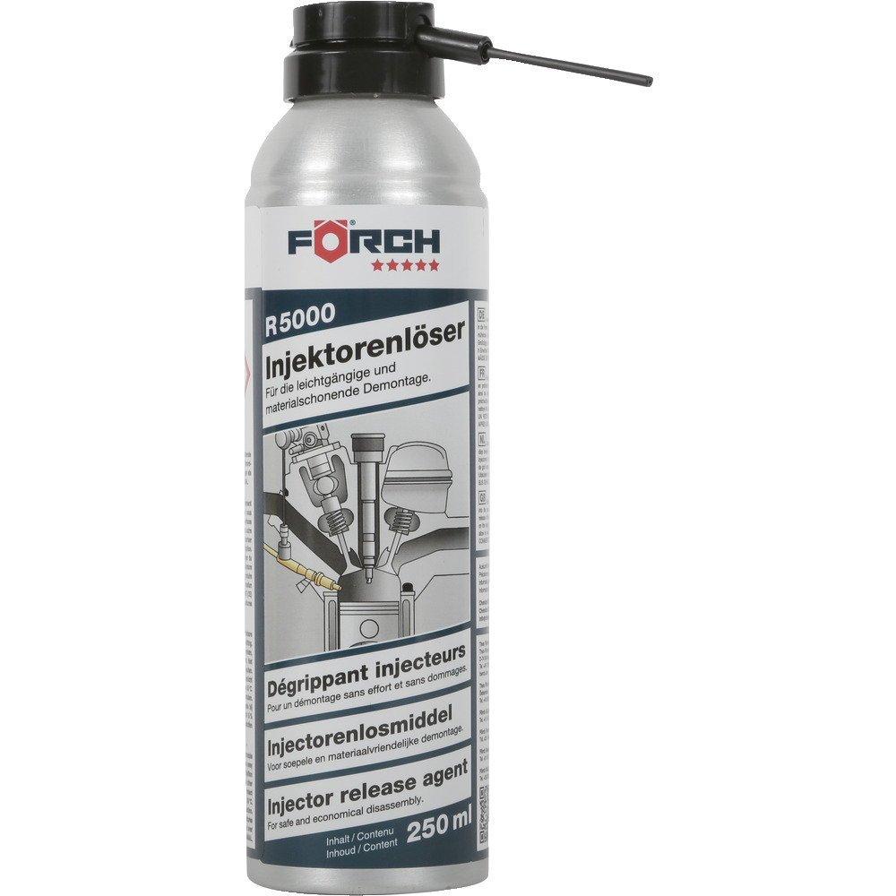 • uvolňovač injektorů R5000 FÖRCH 5* proniká díky inovativnímu složení hluboko do pórů, proniká zbytky vzniklými karbonizací a oxidací, a tak umožňuje snadné uvolňování injektorů, vstřikovacích trysek, zapalovacích nebo žhavicích svíček